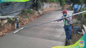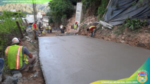 Personal asignado continúa trabajando en la construcción de bordillos, banquetas y cunetas en el proyecto de pavimentación que brindará una mejor conexión de nuestros vecinos hacia el periférico del municipio. Solicitamos a la población conducir con precaución y moderación, ya que los trabajos continúan en desarrollo.