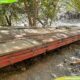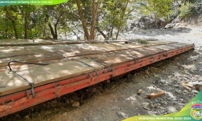 Se realizan trabajos de reforzamiento en la plataforma móvil que será colocada en los próximos días sobre el río Motagua, ruta que conduce de Aldea Lo...